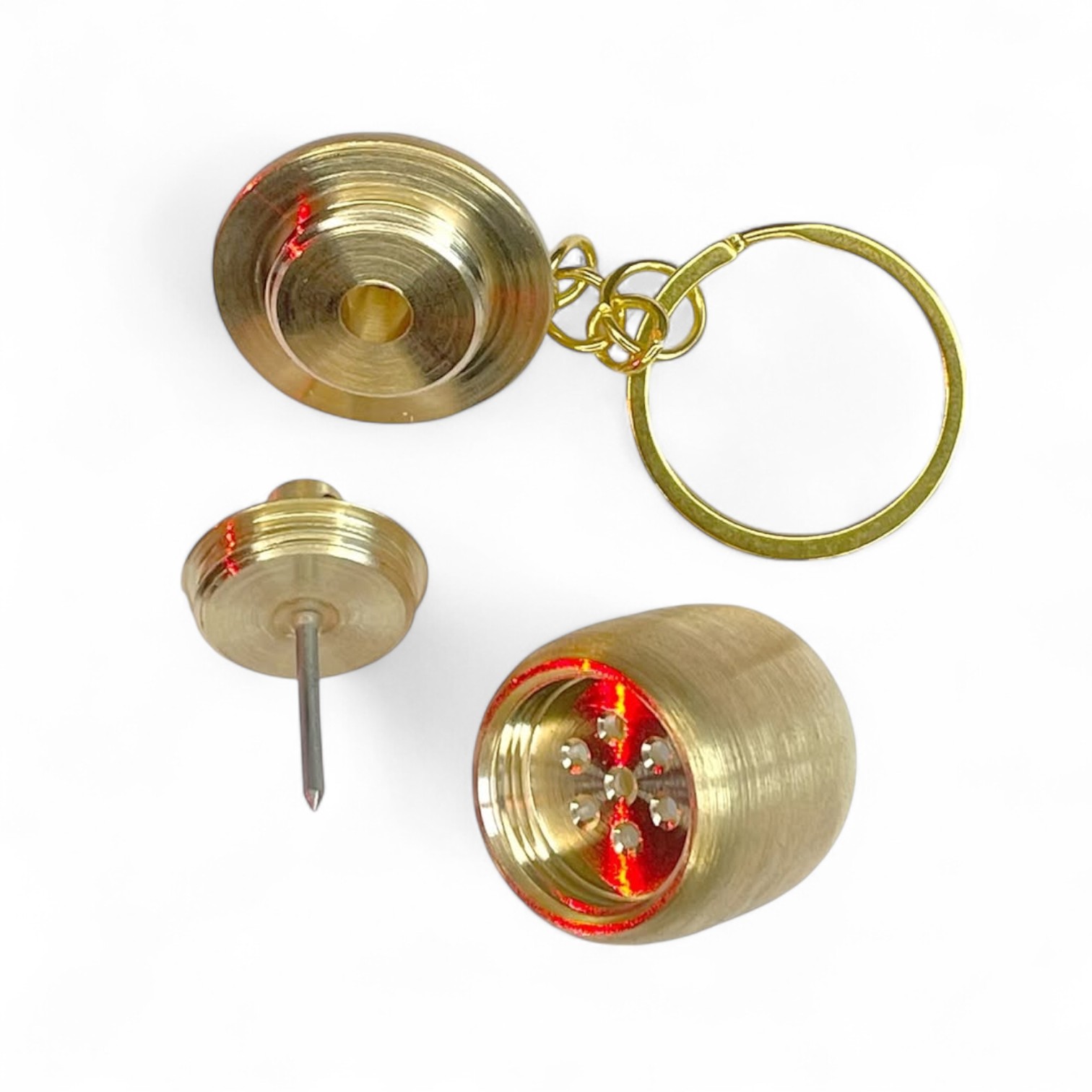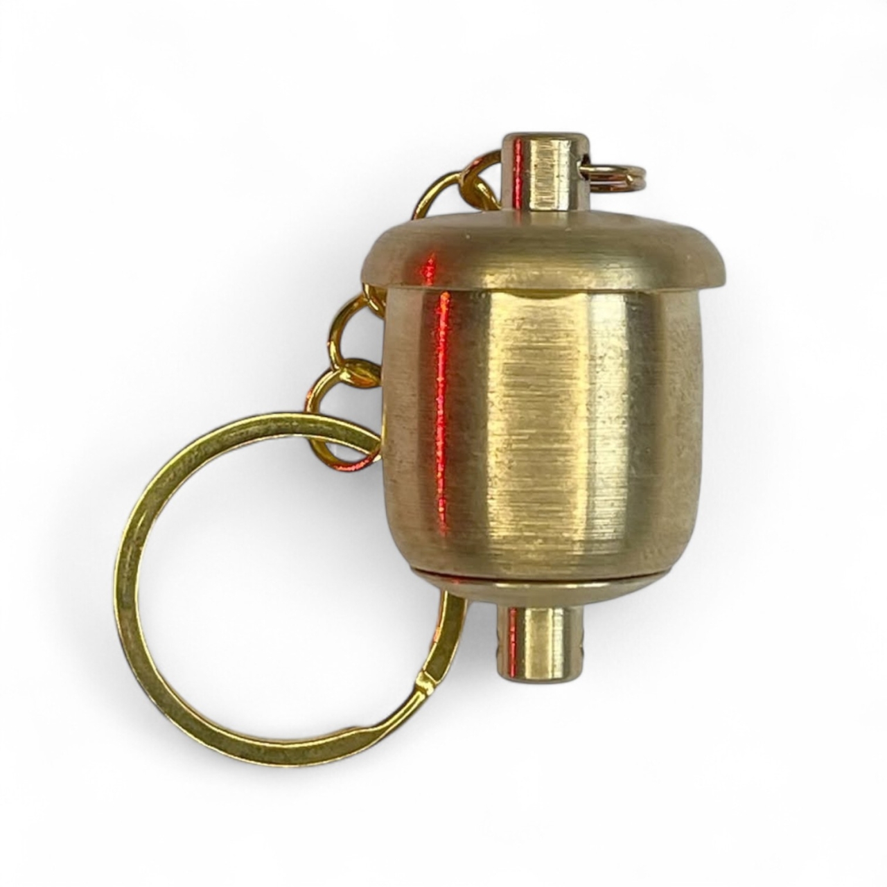 “Желудь” — это миниатюрный наперсток-напас в виде стилизованного жёлудя. Внешне он выглядит как изысканный брелок в природной тематике, но внутри скрыт полноценный функционал: чаша с сеткой и штифт для прочистки. Выполнен из металла с золотистым покрытием — отлично смотрится на связке ключей или в кармане.