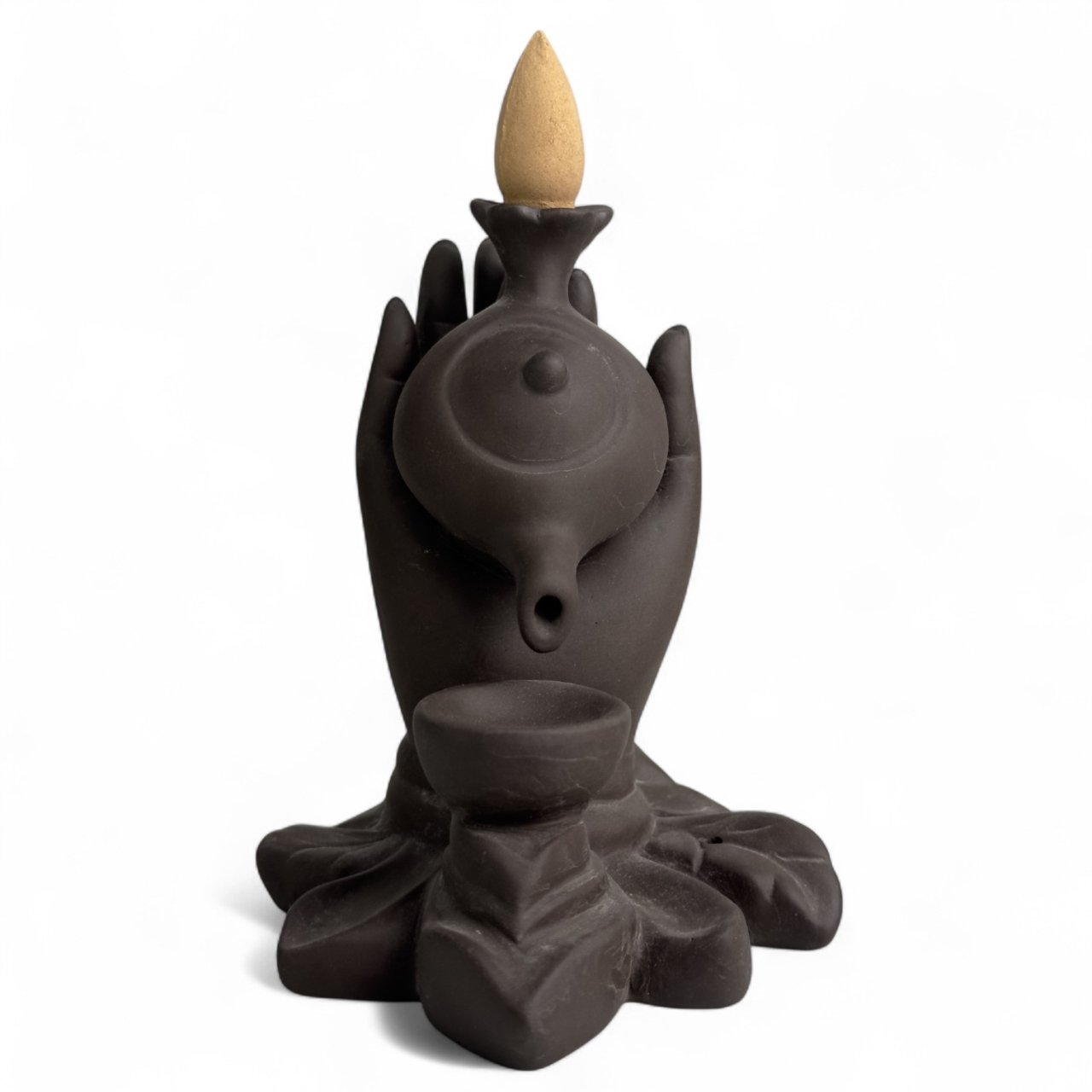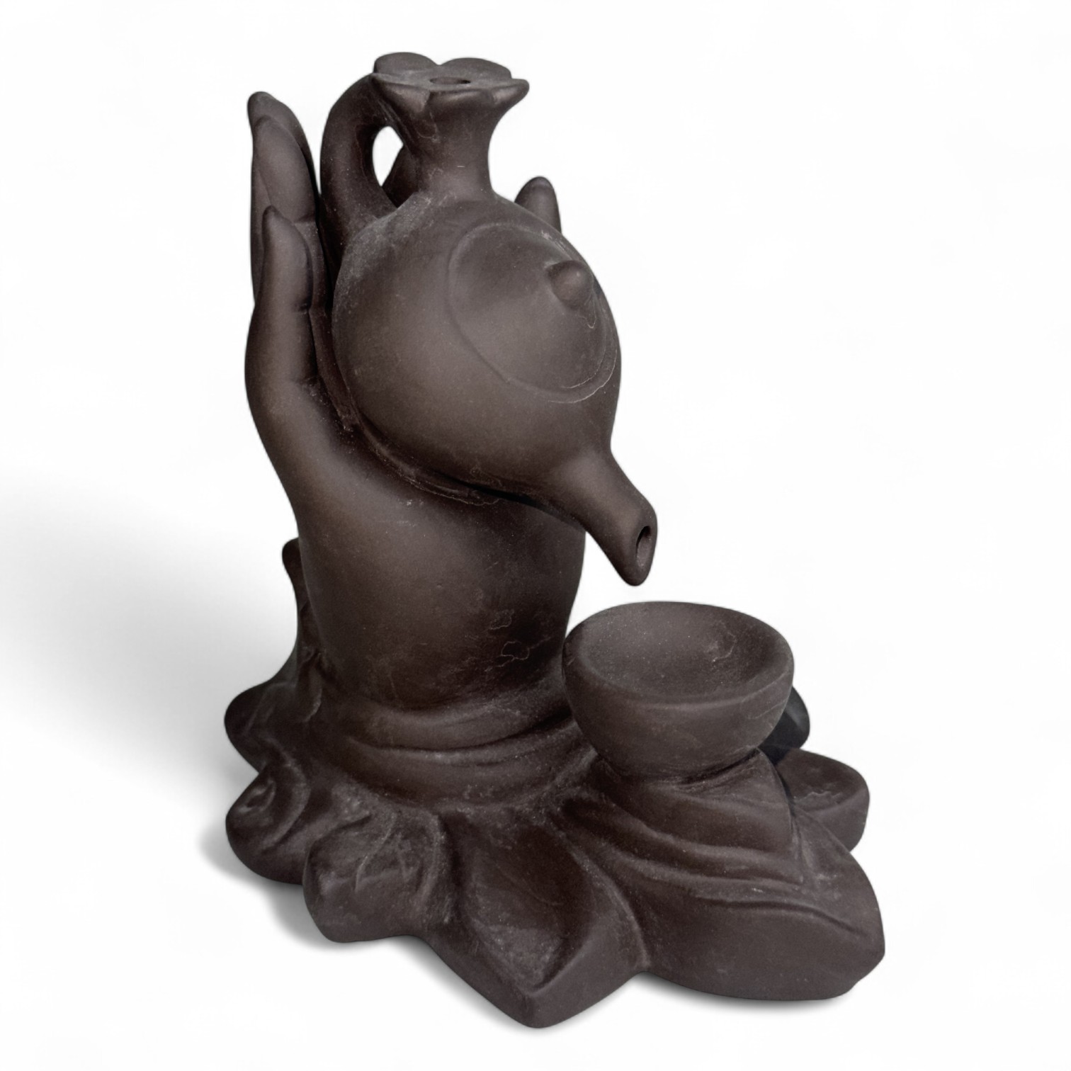 Уникальная глиняная подставка, выполненная в виде изящной руки, держащей чайник, из которого "льется" аромат — в чашу внизу.
