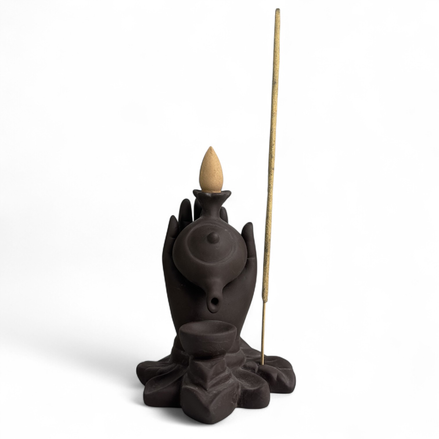 Когда благовоние зажжено и установлено в чайник, дым плавно опускается вниз, создавая эффект "наливающегося" аромата в чашу. Эффектно смотрится как в интерьере дома, так и в зонах релаксации или медитации.