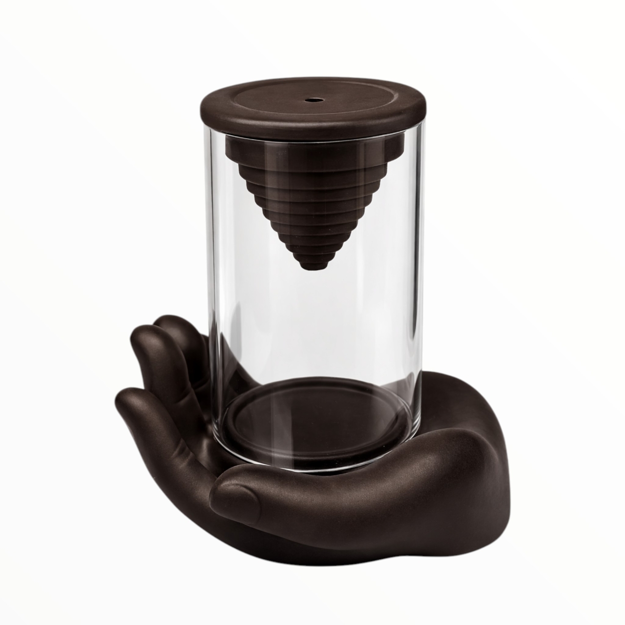 Основание в форме ладони символизирует заботу и спокойствие, словно удерживая аромат в пространстве и наполняя его уютом. Верхняя часть с конусообразным держателем обеспечивает равномерное тление благовоний и аккуратное распределение дыма внутри колбы.