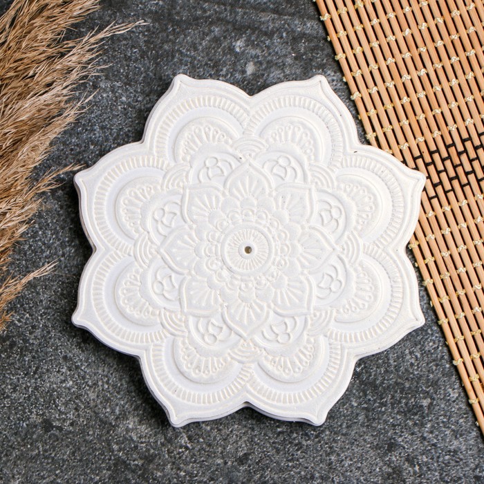 Подставка выполнена в виде мандалы- сакрального символа, используемого при медитациях, является ритуальным предметом, символизирует сферу обитания божеств, чистые земли будд.