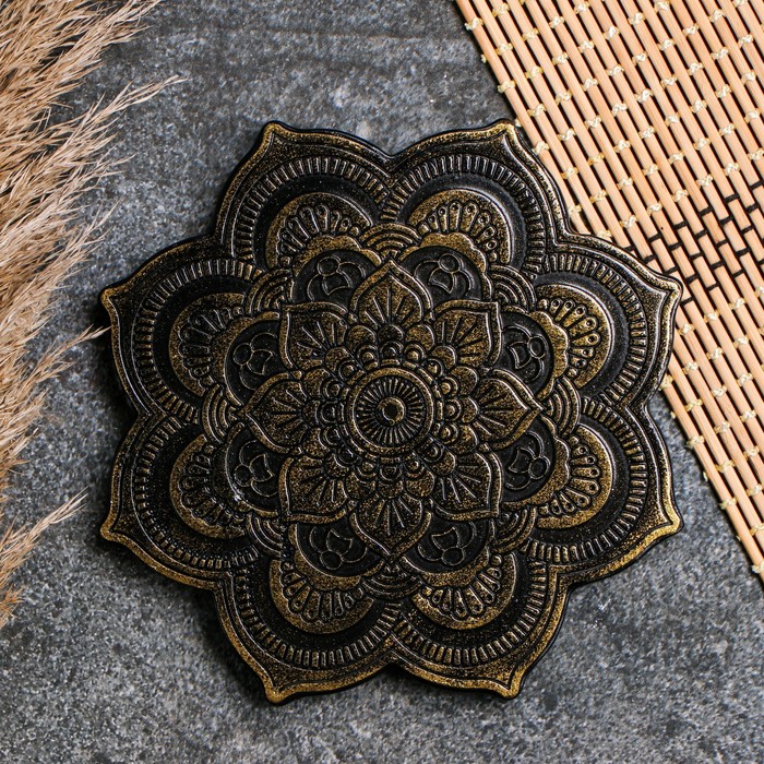 Подставка выполнена в виде мандалы- сакрального символа, используемого при медитациях, является ритуальным предметом, символизирует сферу обитания божеств, чистые земли будд.