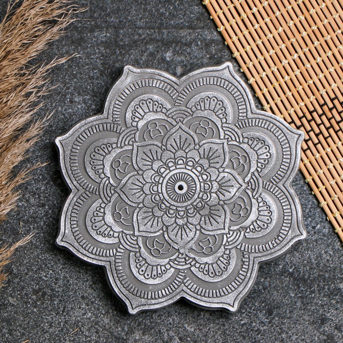 Подставка выполнена в виде мандалы- сакрального символа, используемого при медитациях, является ритуальным предметом, символизирует сферу обитания божеств, чистые земли будд.