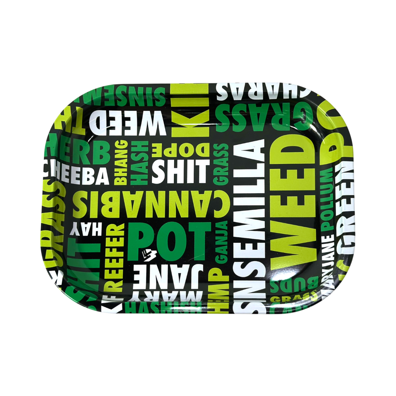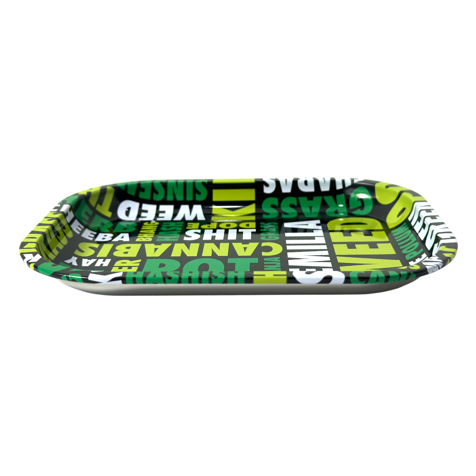 Этот стильный поднос для самокруток выполнен в ярком современном дизайне с коллажем из сленговых названий. Контрастные оттенки зелёного, жёлтого и белого выделяются на чёрном фоне, создавая динамичный и запоминающийся вид. Прочный материал и удобная форма делают поднос идеальным для подготовки самокруток: бортики предотвращают рассыпание, а гладкая поверхность облегчает уход. Отличный аксессуар для тех, кто ценит практичность и оригинальный дизайн.