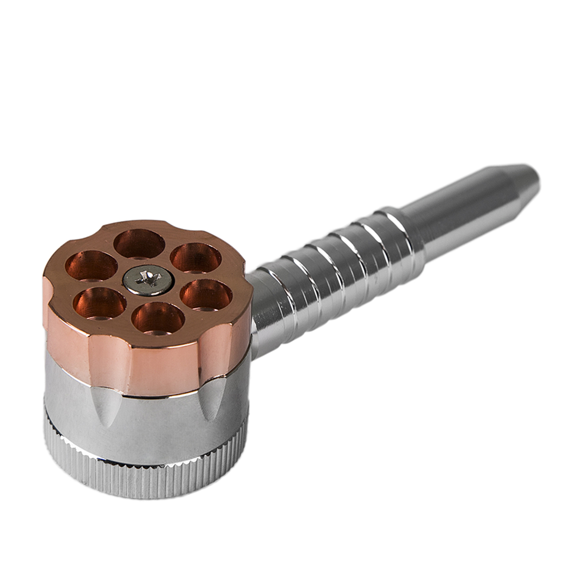 Необычная трубка длиной 12 сантиметров, со встроенным мини-гриндером и шестью отверстиями. Six Shooter это потенциальная игра в "Русскую рулетку" или целый ритуал на небольшую компанию. Трубка разбирается на три части: две подвижных - непосредственно "барабан" и крышка гриндера, и основа с сеткой. При помощи гриндера можно измельчать табак и тут же прикуривать.