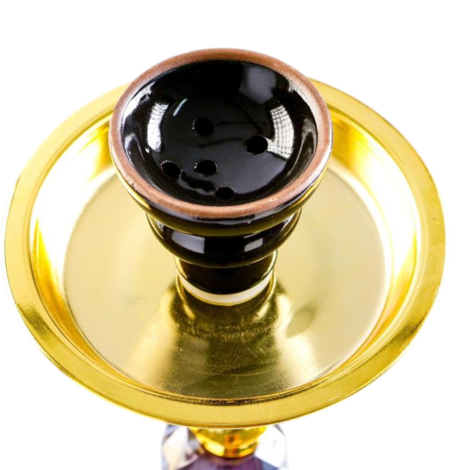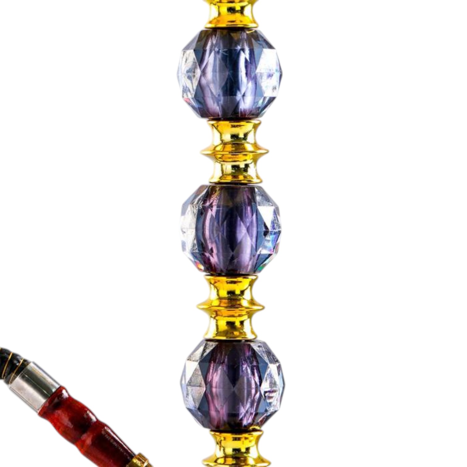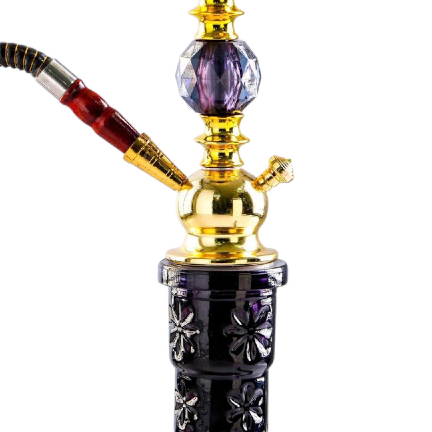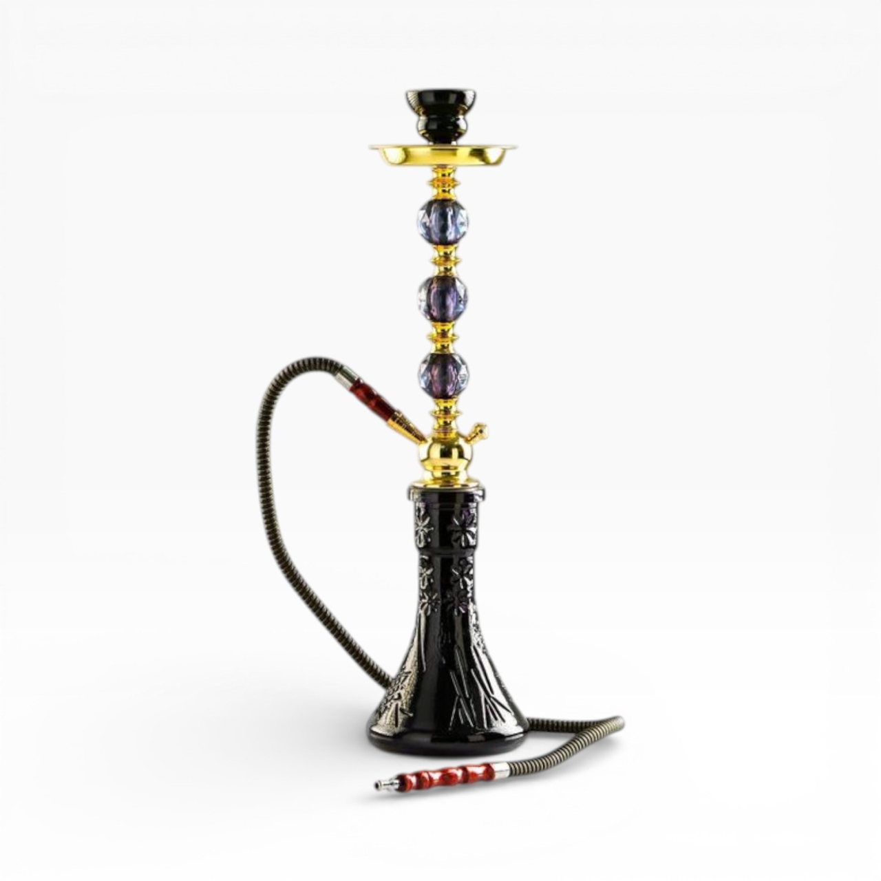 Элегантный высокий кальян в классическом восточном стиле с выразительным сочетанием чёрного стекла и золотых металлических элементов. Декоративная шахта с прозрачными вставками создаёт эффект глубины и подчёркивает статусный внешний вид модели.